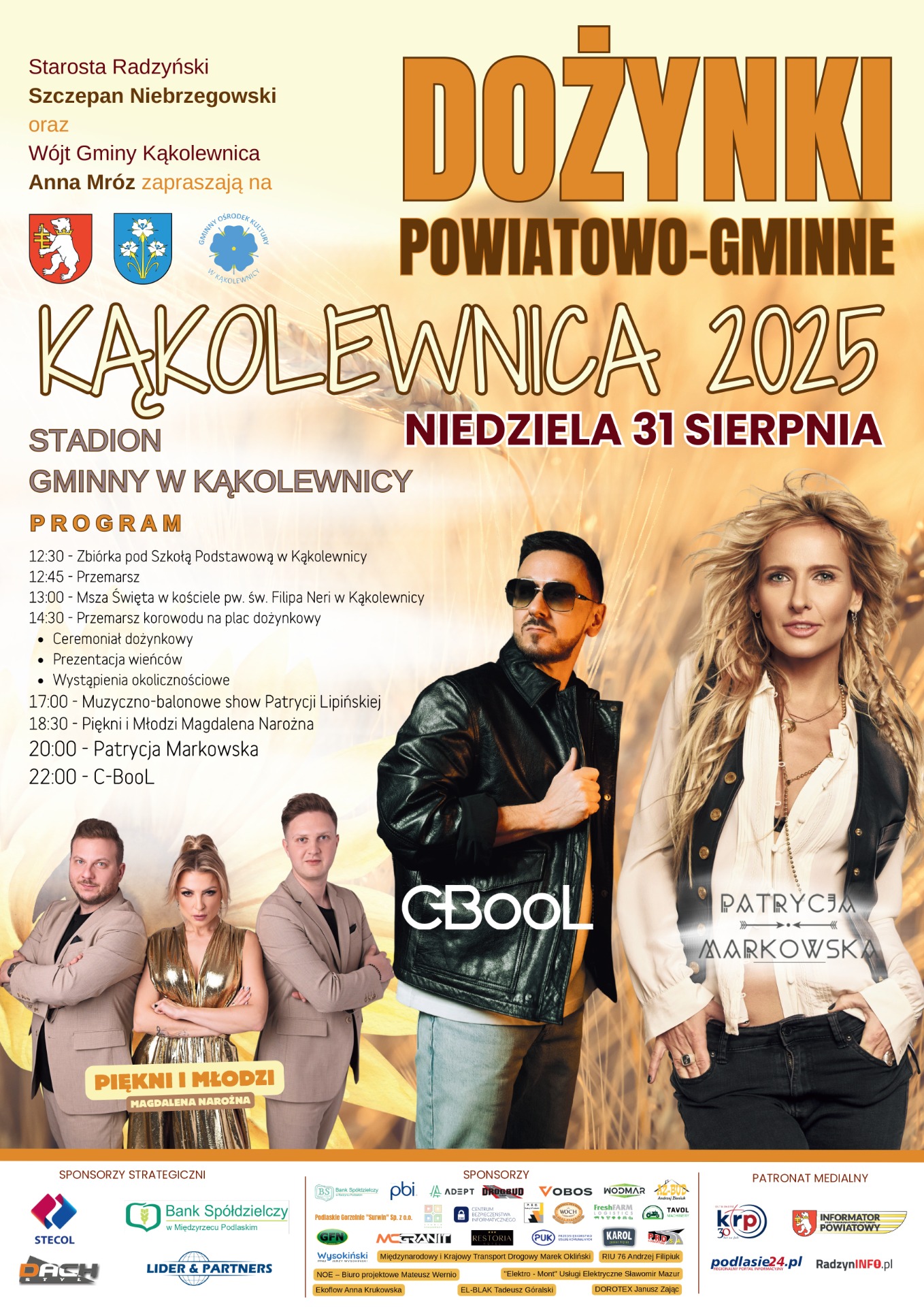 Dożynki powiatowo-gminne w Kąkolewnicy już pod koniec wakacji. W niedzielę, 31 sierpnia 2025 roku, na stadionie gminnym odbędzie się święto plonów, które połączy tradycję z muzyczną rozrywką. Organizatorami wydarzenia są starosta radzyński Szczepan Niebrzegowski oraz wójt gminy Kąkolewnica Anna Mróz.