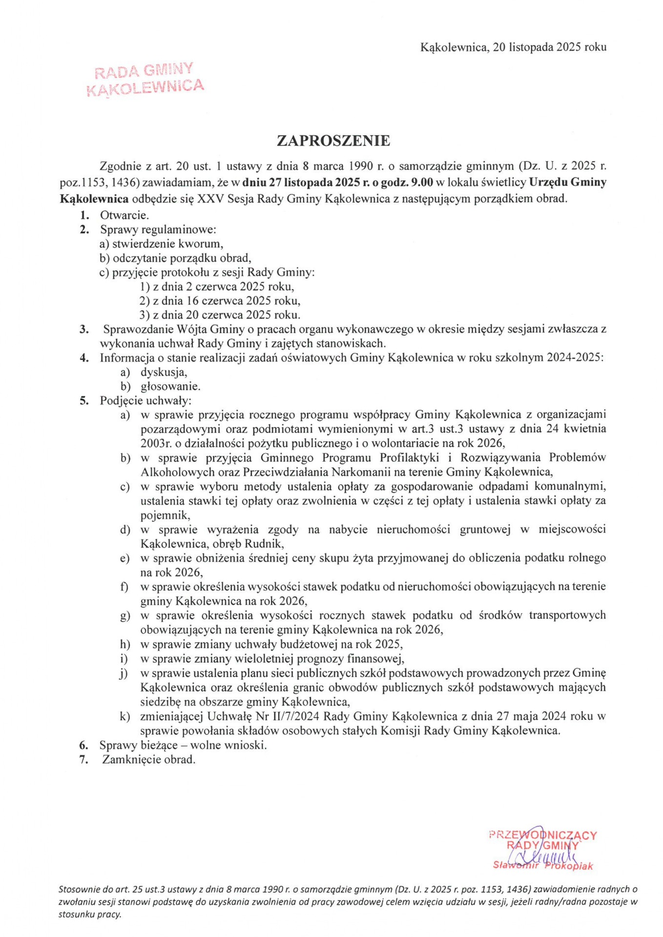 Zaproszenie na Sesję Rady Gminy Kąkolewnica w dniu 27 listopada 2025 r., o godz. 09:00 w lokalu świetlicy Urzędu Gminy Kąkolewnica