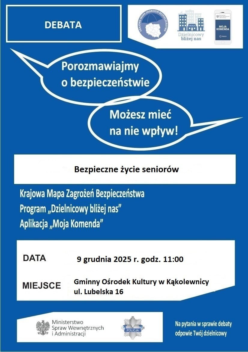 Seniorzy z gminy Kąkolewnica będą mogli wziąć udział w debacie społecznej dotyczącej bezpieczeństwa. Wydarzenie odbędzie się 9 grudnia 2025 roku o godzinie 11:00 w Gminnym Ośrodku Kultury w Kąkolewnicy przy ul. Lubelskiej 16.